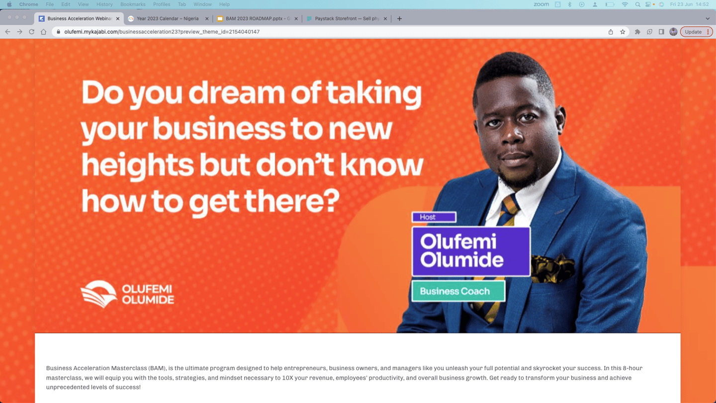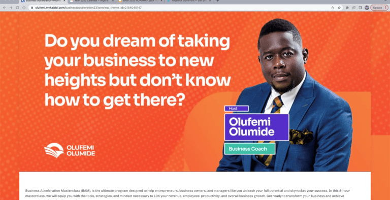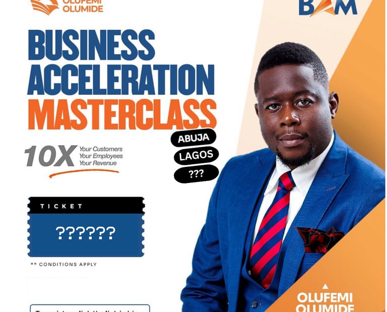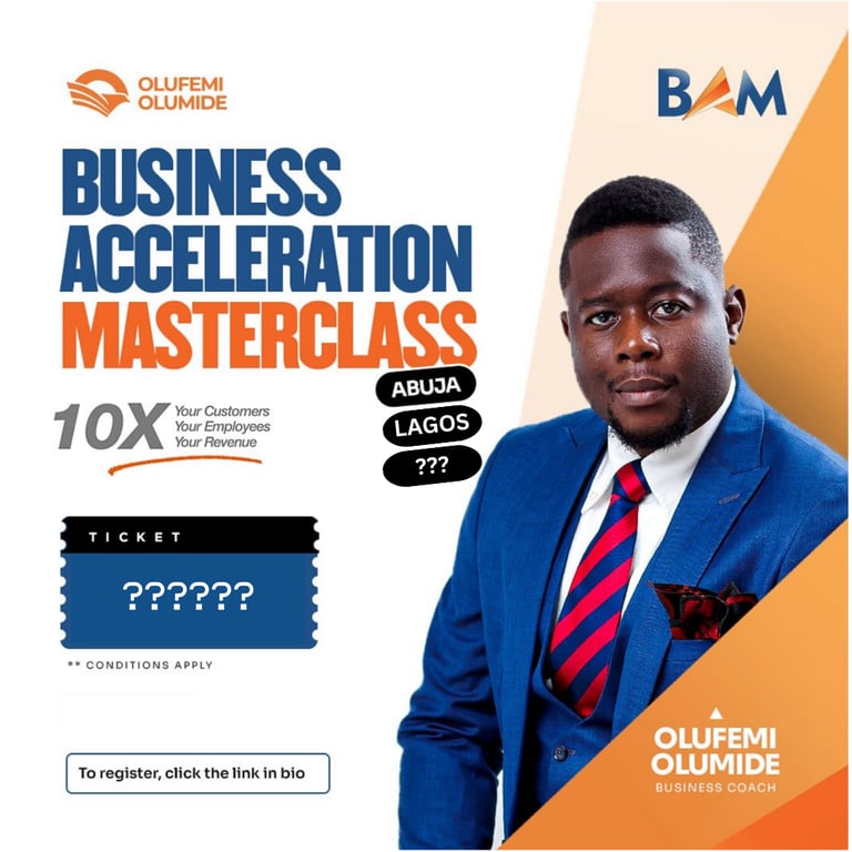 The Business Acceleration Masterclass (BAM) is a power-packed one-day business training event meticulously crafted to help you 10X your revenue, customers, employees, processes and systems, as well as scale your business like never before. This 8-hour intensive workshop is led by Dr. Olufemi Olumide one of Africa's finest business coaches. To sign up for the Accelerators Mastermind, click the link to sign up NOW!
